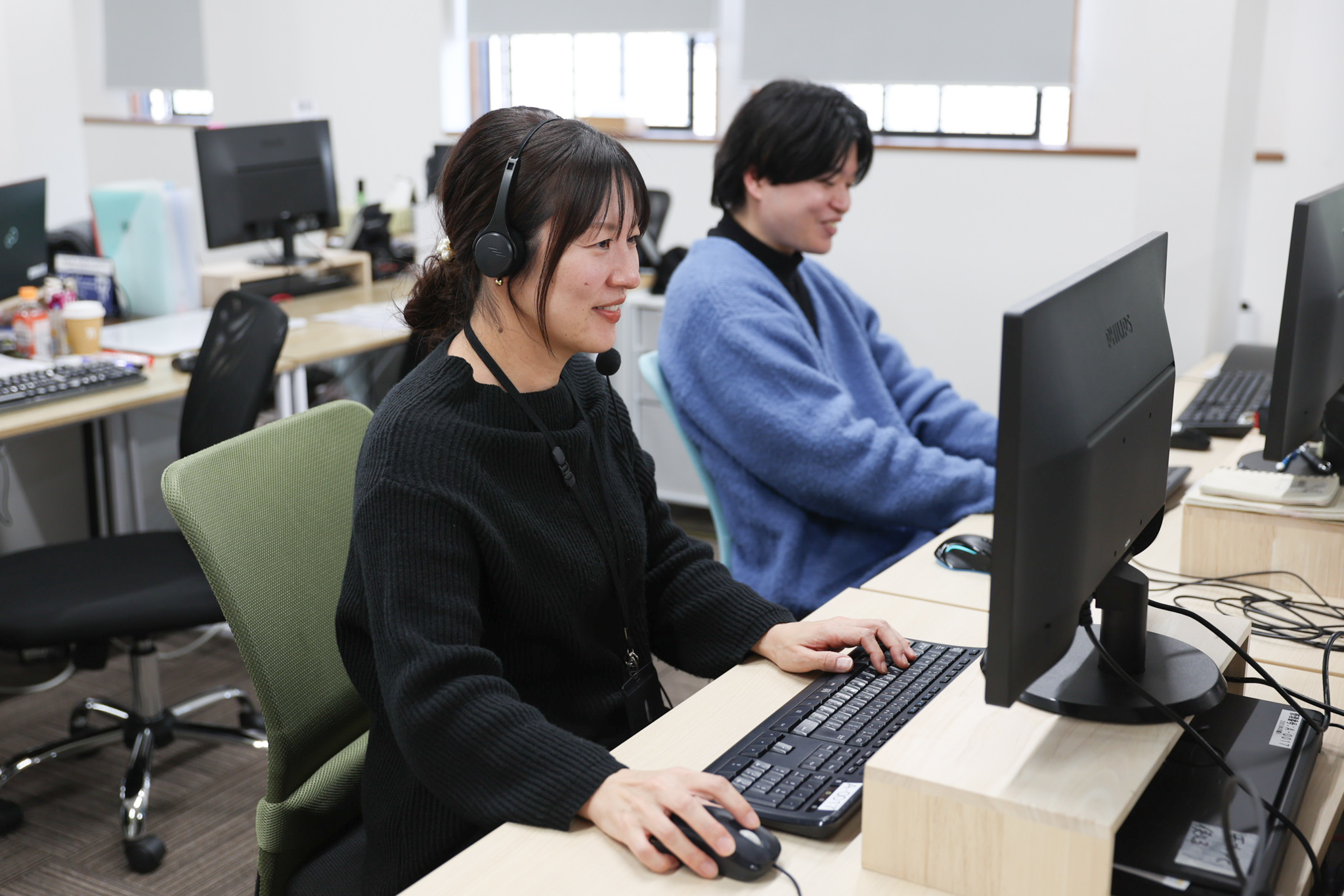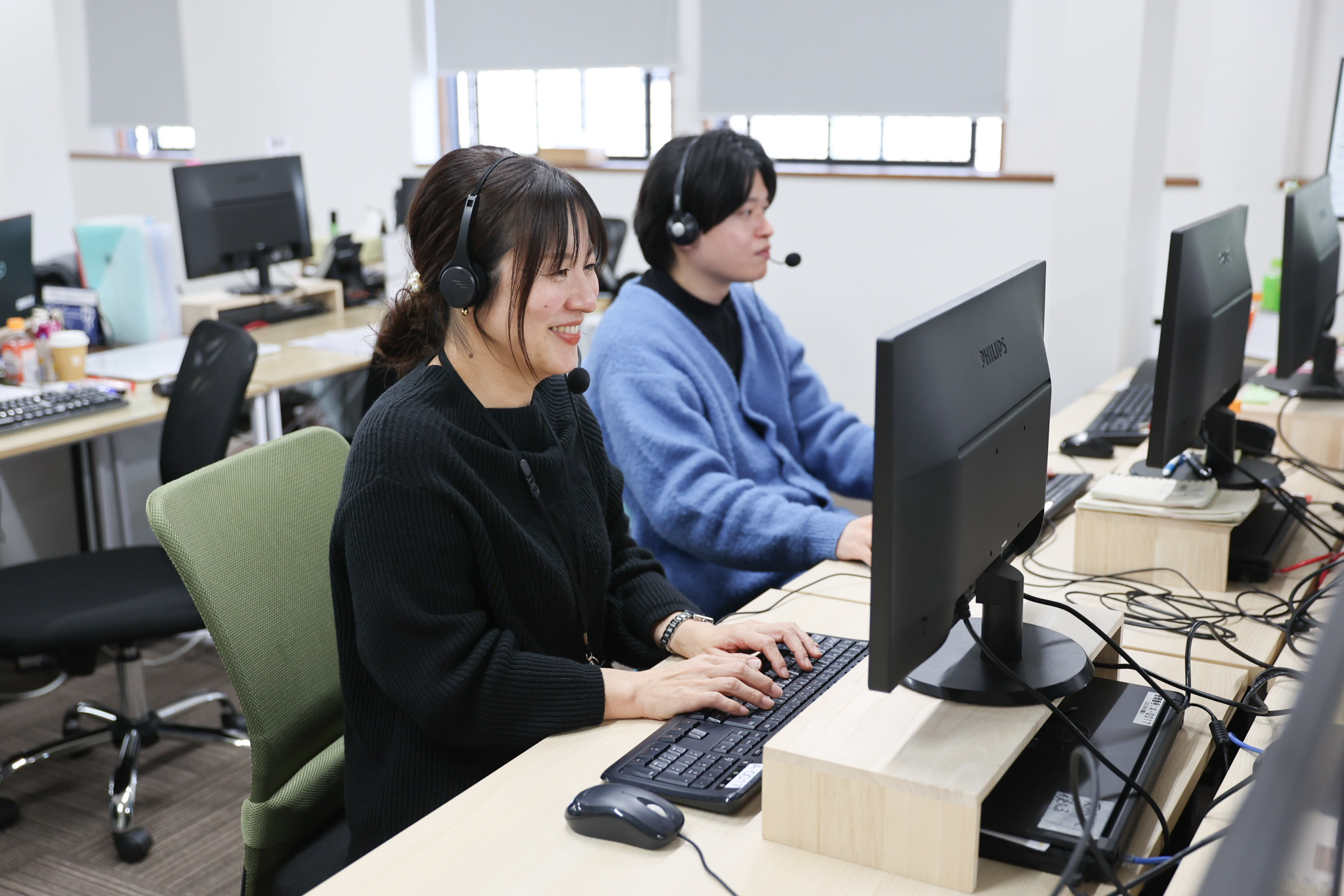 DTSの都城コールセンターでは、8割のスタッフが未経験スタート。入社後はマニュアルに沿って研修を行い、ロールプレイングを通して電話対応の基本から丁寧に学べます。実際の受電が始まってからも、困ったらすぐに手を挙げて相談できる環境があり、リーダーが近くで常にサポート。「クレームが心配だったけれど、チームで仕事をしているので、先輩やリーダーがすぐに駆けつけてくれるから安心」という声も多く、サポート体制の手厚さが魅力です。業務は基本的にデスクワークで、体力的な負担も少なめ。電話対応やPC入力に慣れていない方でも、一歩ずつステップアップできる環境が整っています。